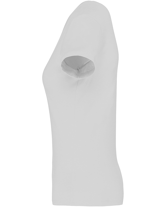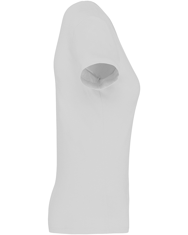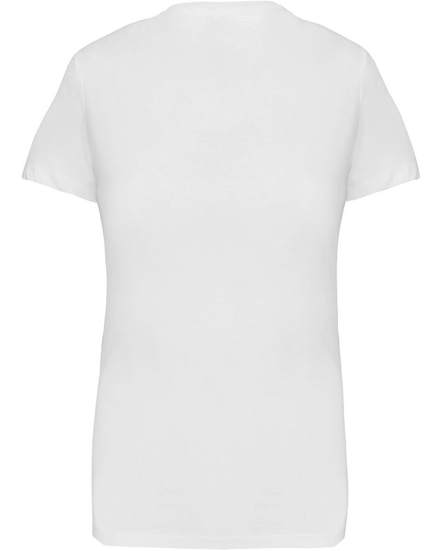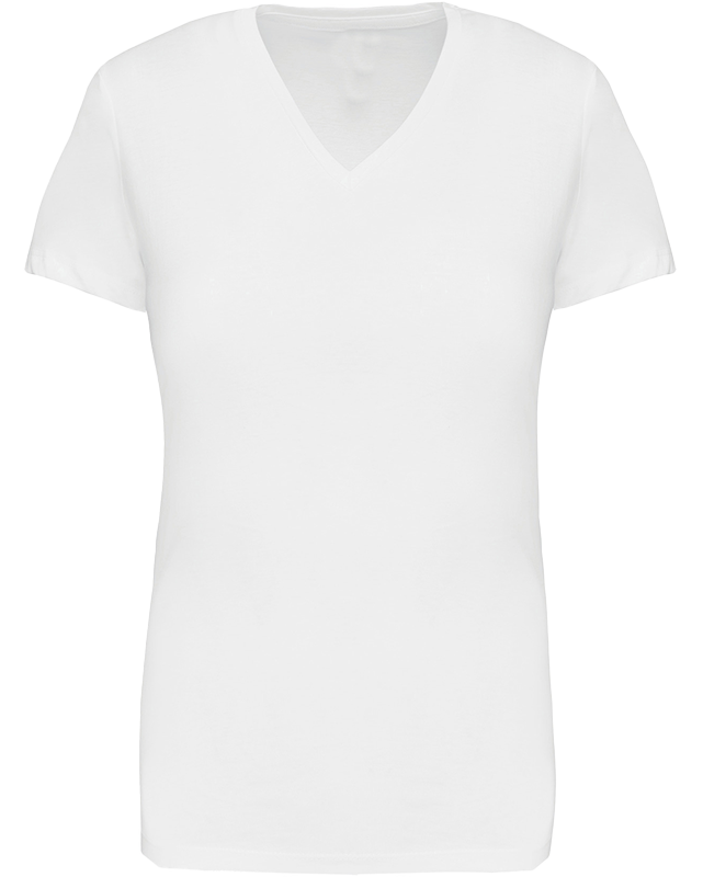 taillierter Schnitt, schmal eingefasster tiefer V-Ausschnitt, Nackenband in Kontrastfarbe bei farbigen und weiß bei weißen Shirts,